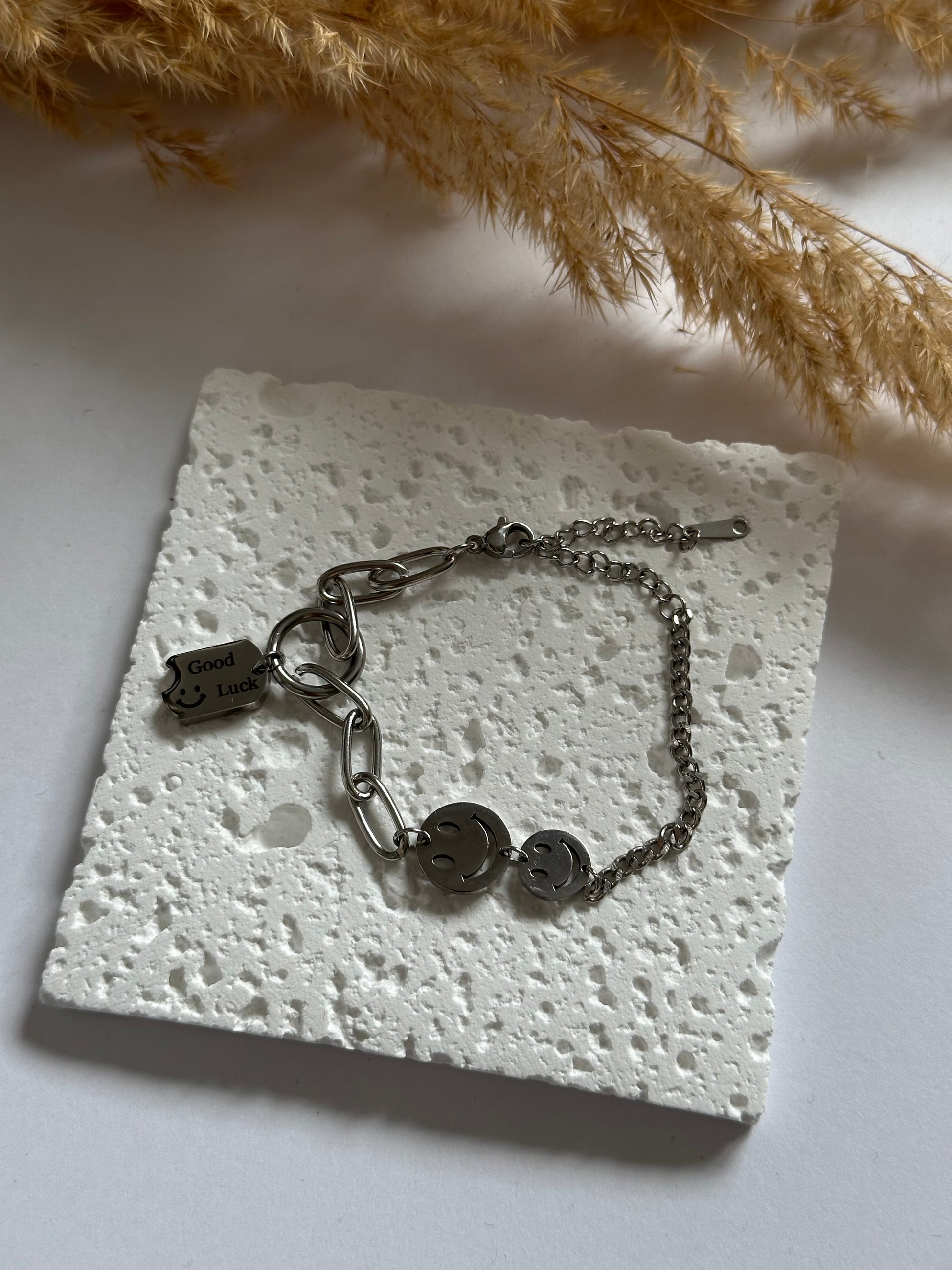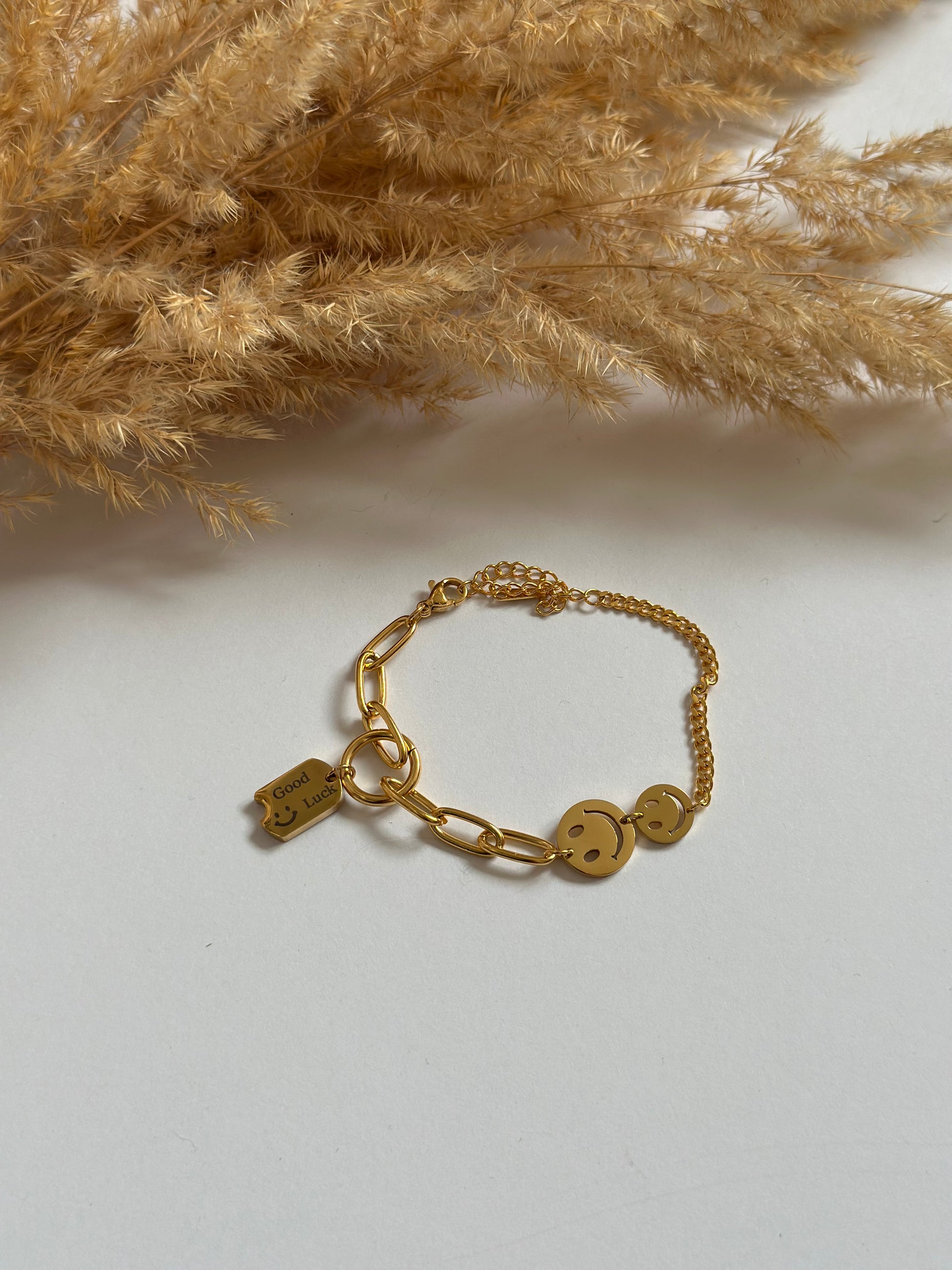 Ein zarter Glücksbringer für dein Handgelenk – das Good Luck Armband mit zwei Smiley-Anhängern sorgt für positive Vibes im Alltag.