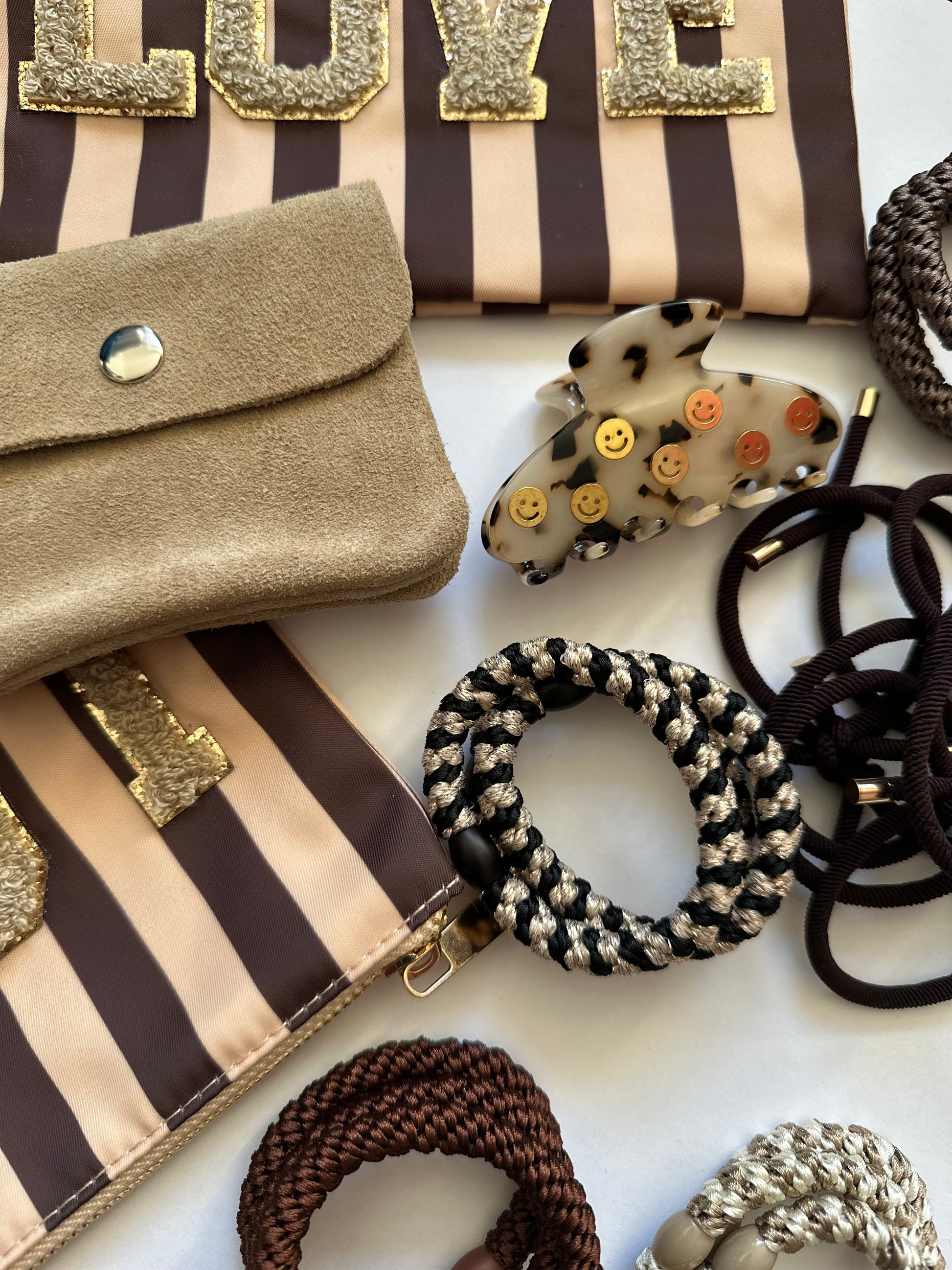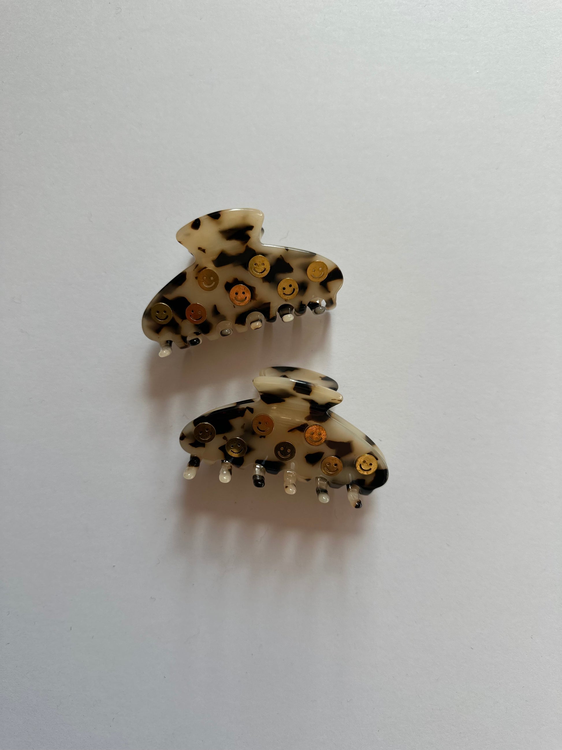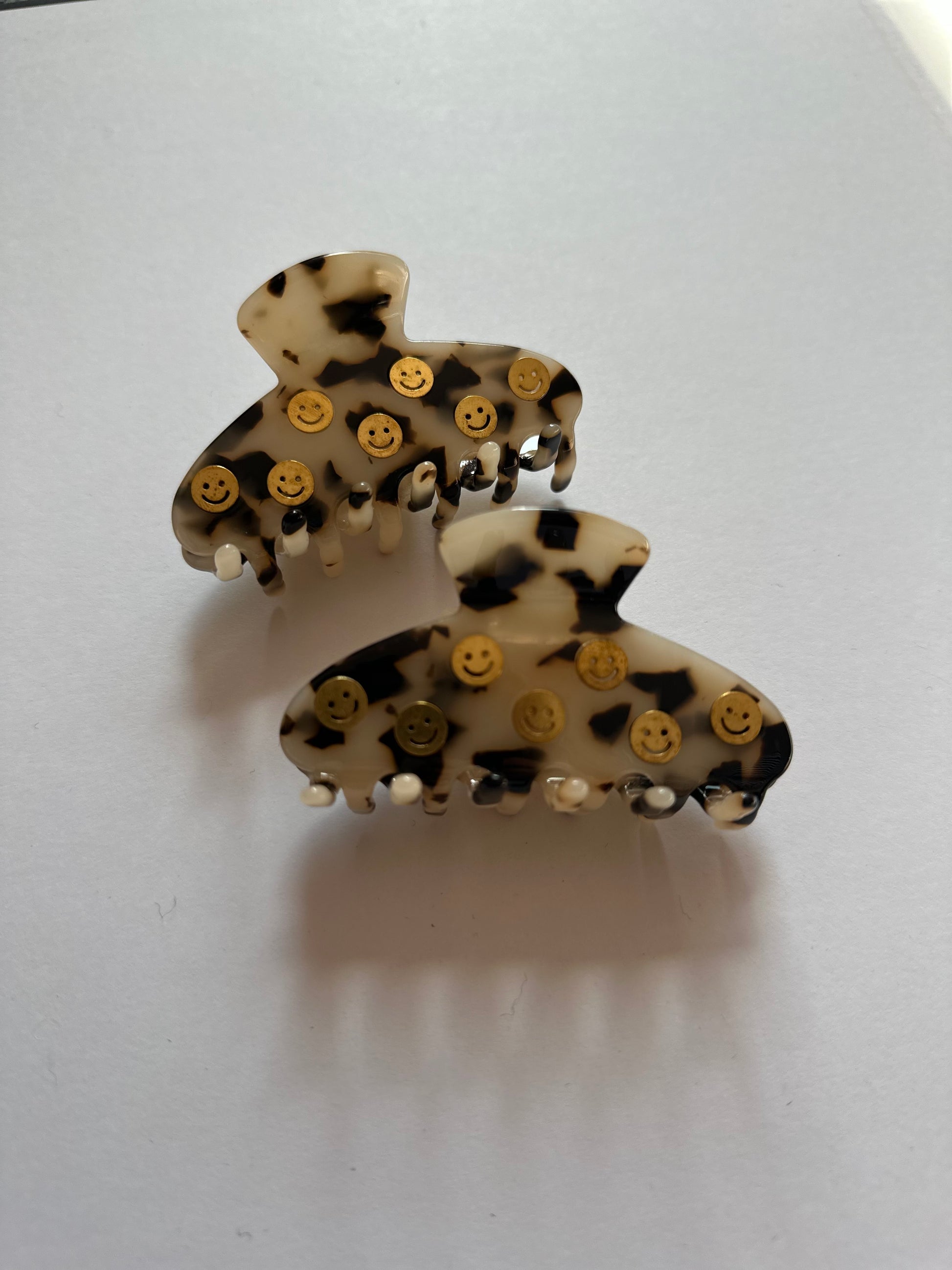 Stylische Haarklammer im Tortoise-Design mit goldenen Smiley-Details. Perfekt für einen fröhlichen Akzent im Alltag und ideal, um deine Haare mühelos zu fixieren.