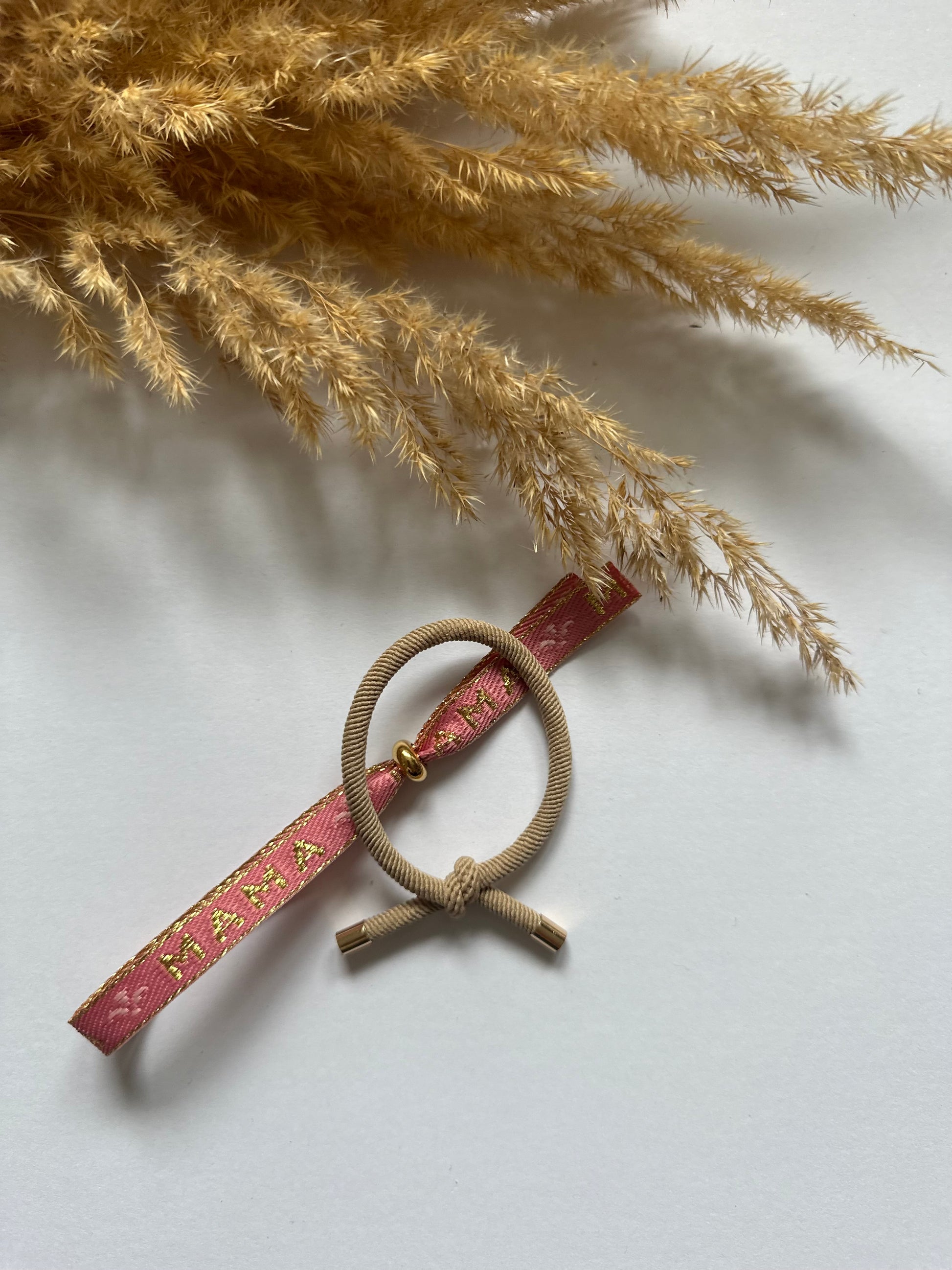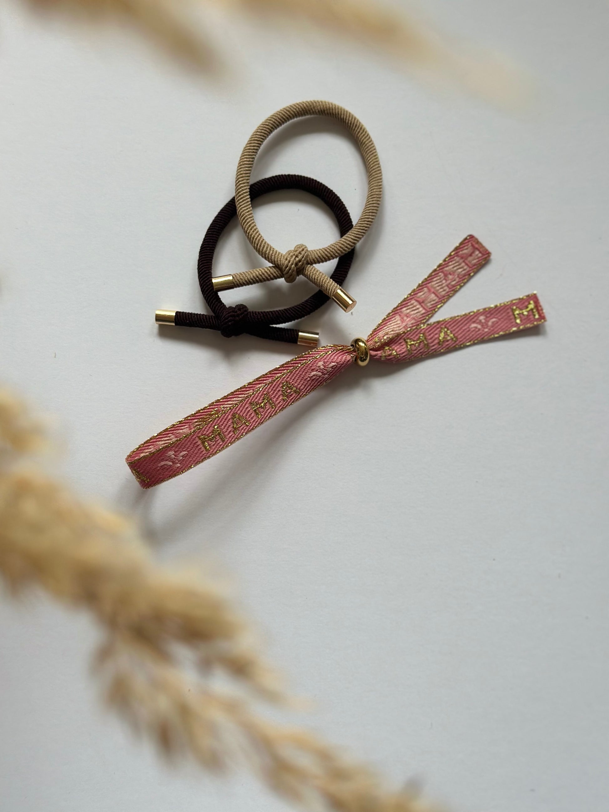 Ein liebevolles Duo: Statementarmband MAMA mit wahlweise beigem oder dunkelbraunem Haargummi - perfekt als Geschenk oder für dich selbst.