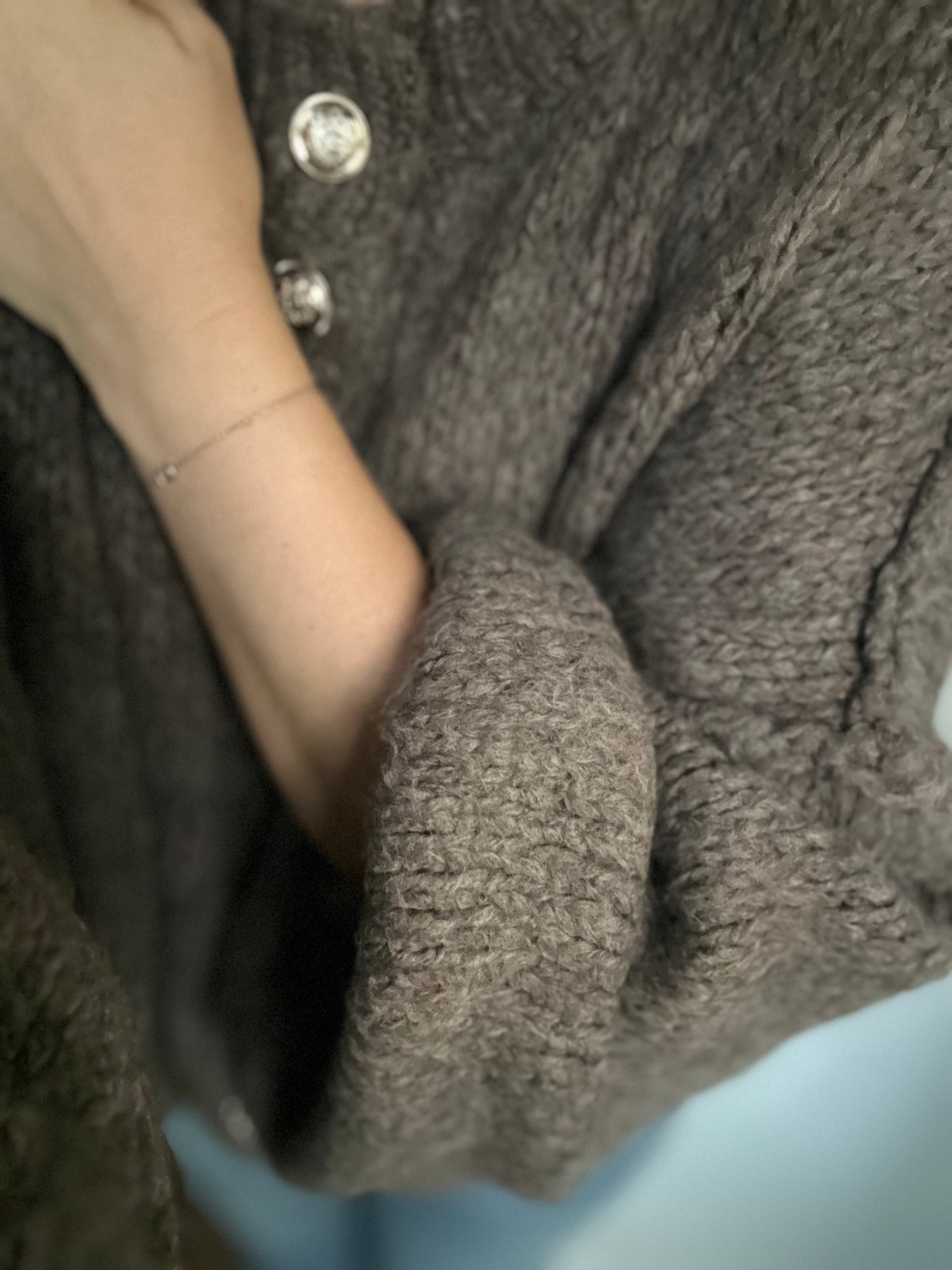 Dieser Strickcardigan ist ein echtes Wohlfühlteil – superweich, gemütlich und trotzdem chic. Durch die grobe Strickoptik und die glänzenden Knöpfe wird er zum besonderen Hingucker, den du vielseitig kombinieren kannst. Ob lässig zu Jeans oder elegant über einem Kleid – dieser Cardigan passt sich deinem Stil perfekt an.
