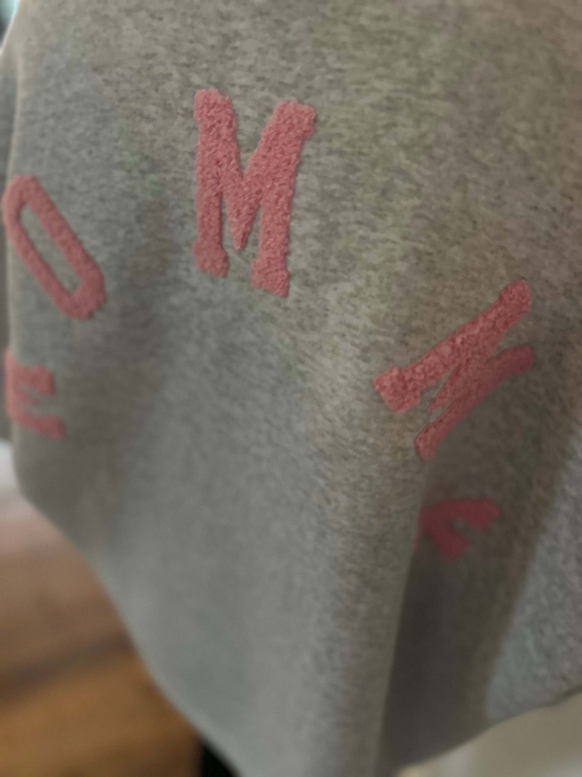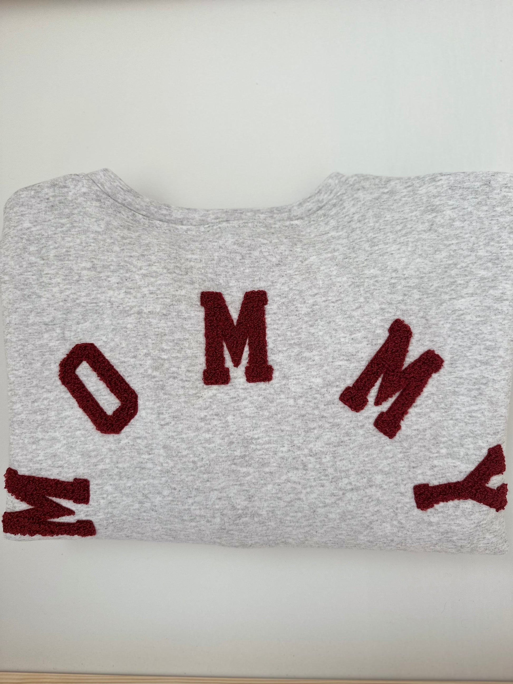 Auf der Rückseite trägt der Pullover die liebevolle Aufschrift MOMMY in flauschigen Bouclé-Buchstaben – wahlweise in Rosa, Hellblau oder Dunkelrot. Die hochwertige Stickoptik verleiht jedem Pullover einen stylischen und gleichzeitig cozy Look.