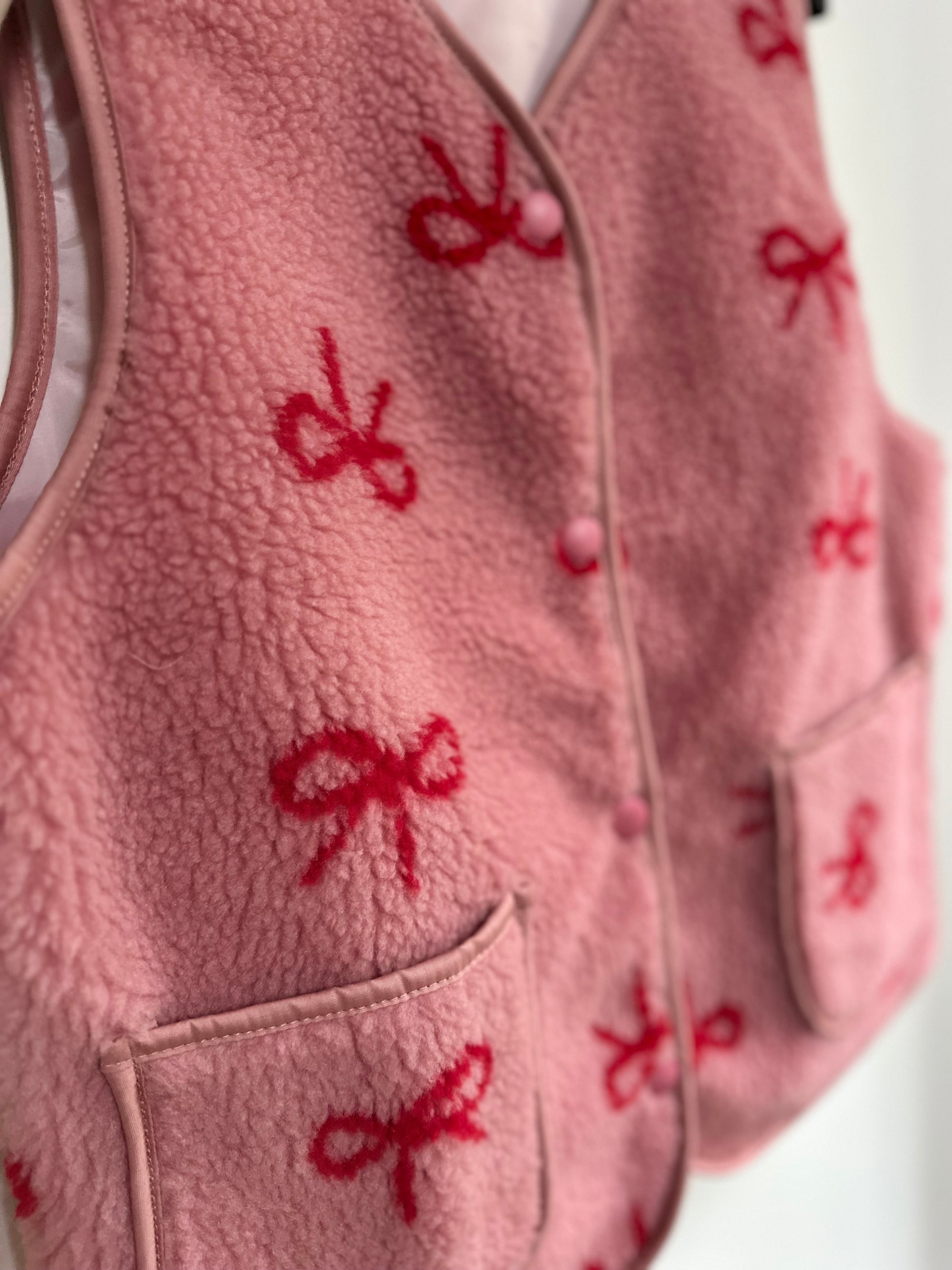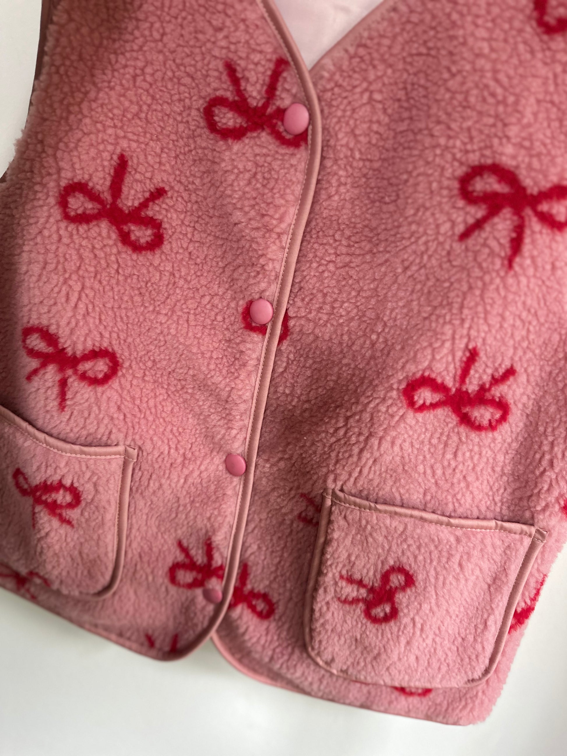 Diese süße Teddyweste ist ein echtes Wohlfühlteil für alle, die verspielte Details lieben. Das weiche Teddy-Material sorgt für ein kuscheliges Tragegefühl, während das zarte Rosa mit den roten Schleifen-Details für einen fröhlichen Look sorgt. Praktische Taschen und Druckknöpfe runden das Design ab und machen die Weste zum perfekten Begleiter für gemütliche Tage oder stylische Freizeit-Outfits.