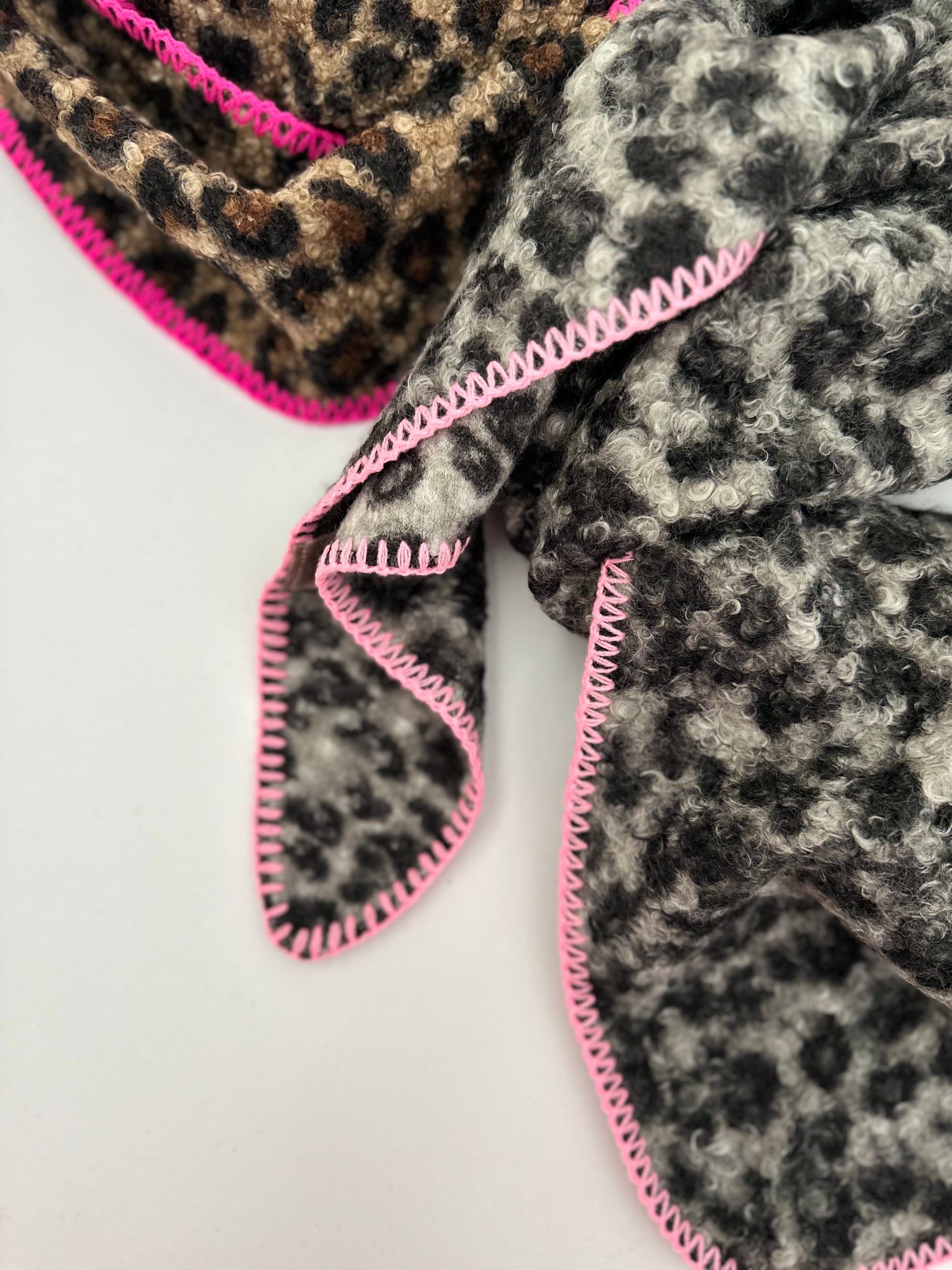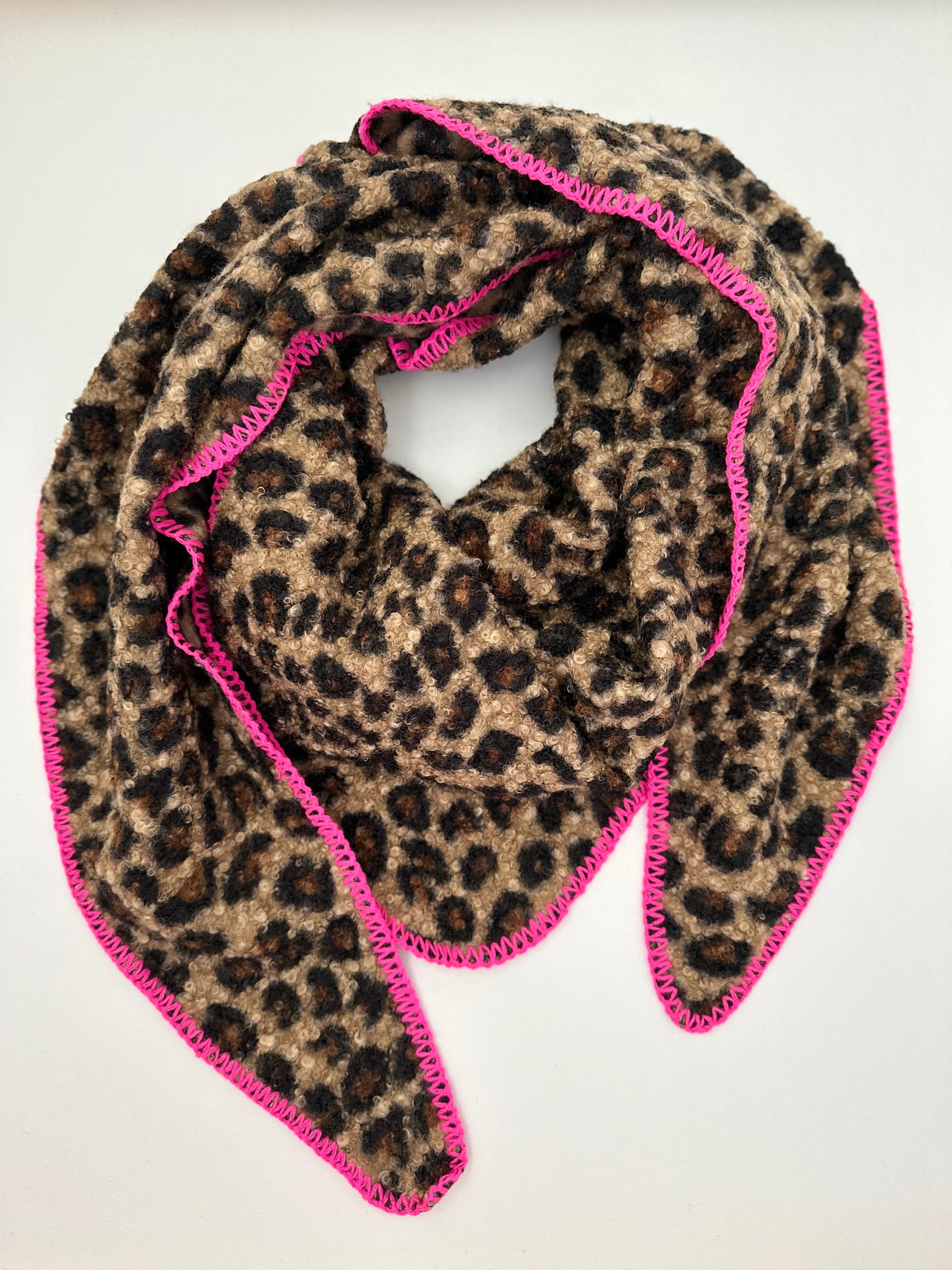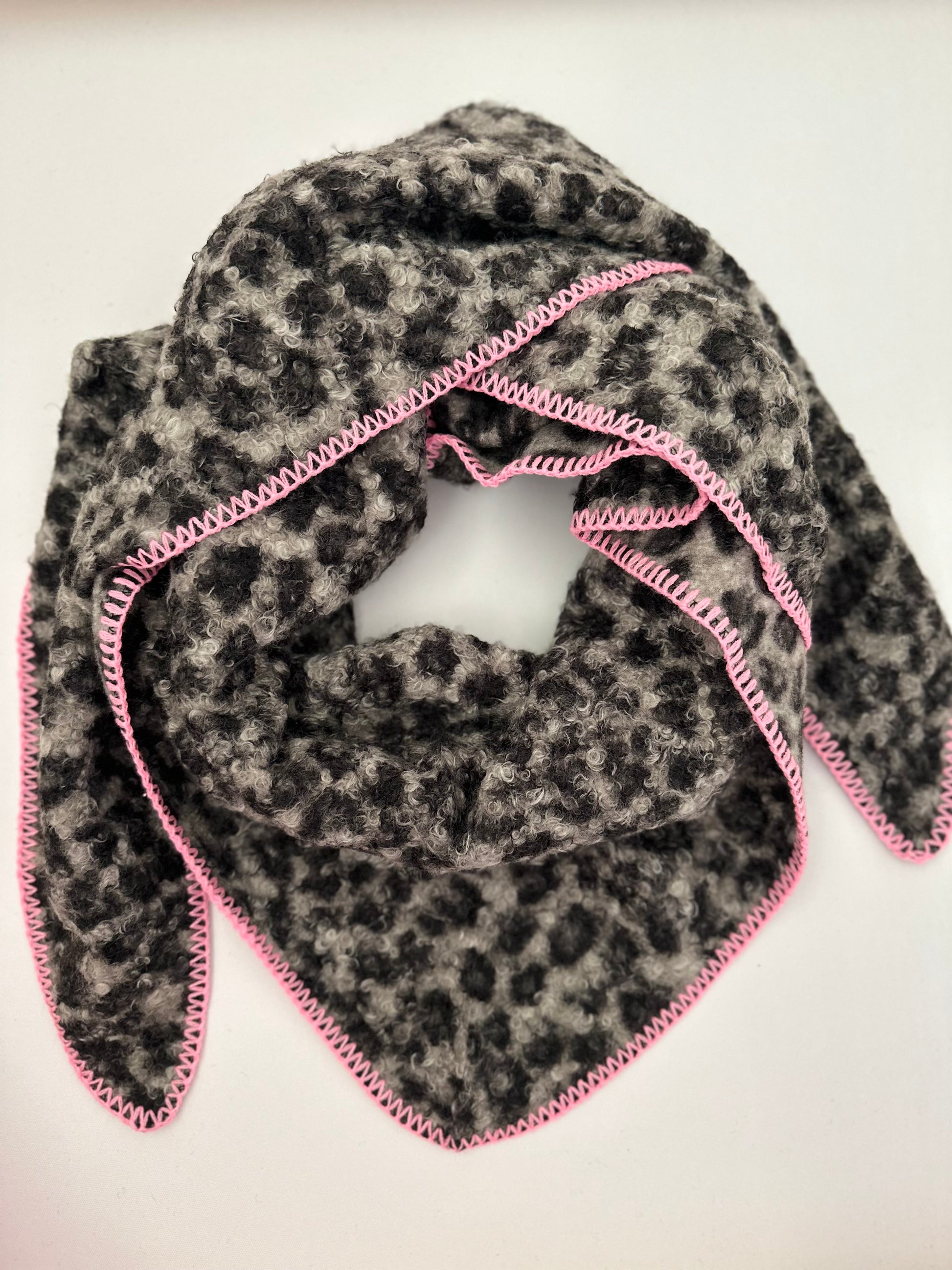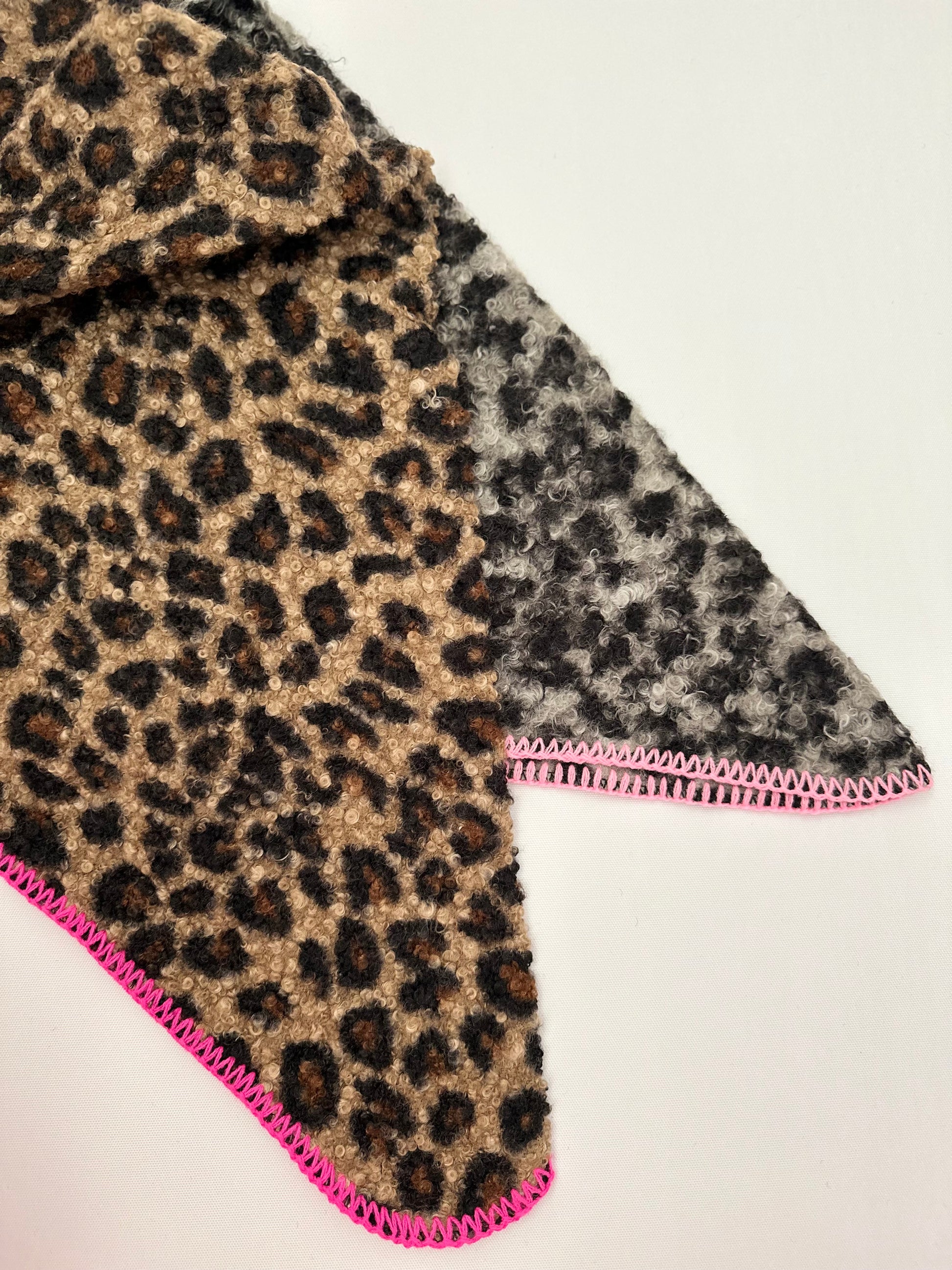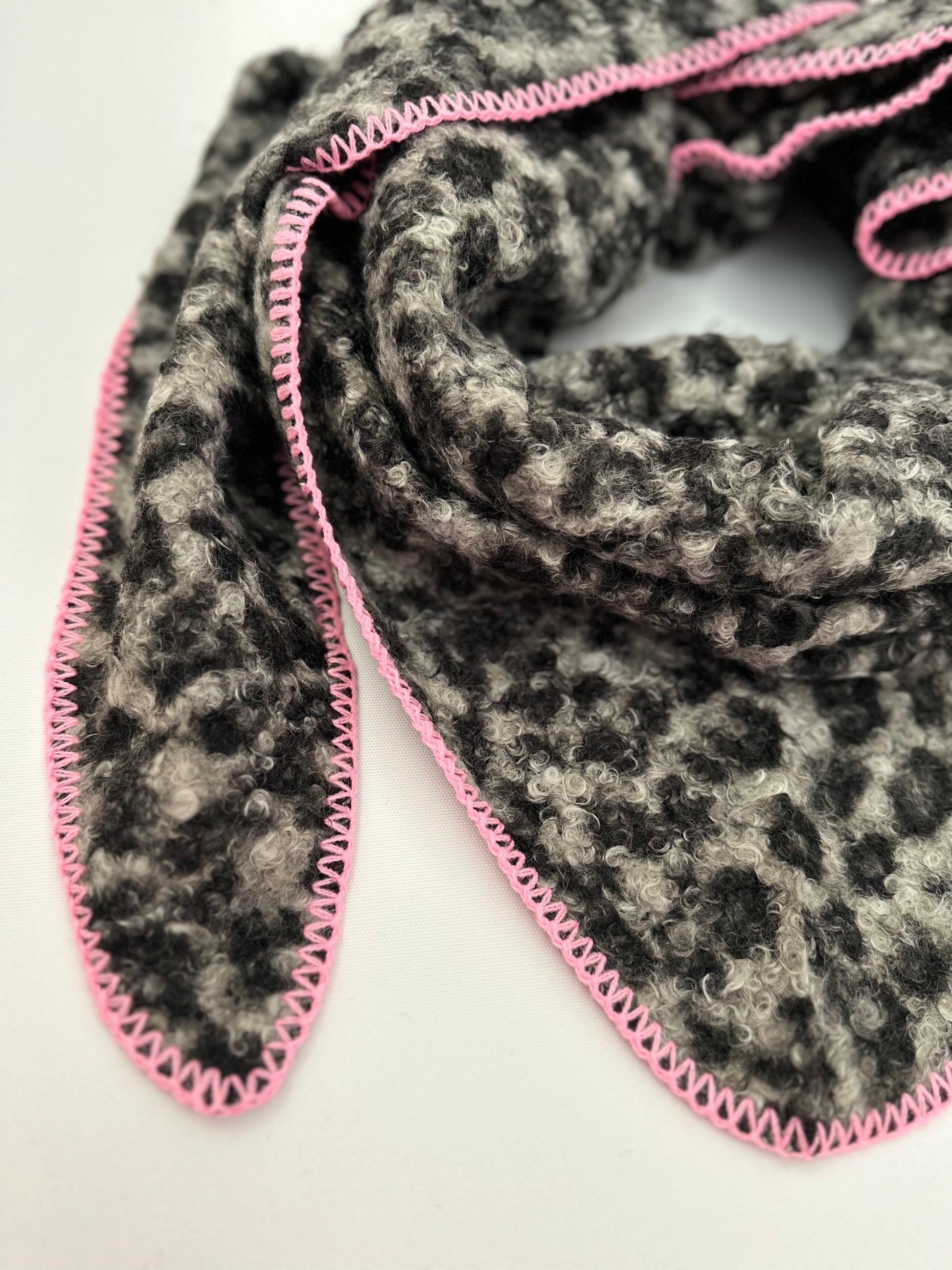 Kuscheliges Dreieckstuch in stylischer Leo-Optik – mit kontrastfarbener rosa/pinker Kettelnaht. Ein leichter, weicher Begleiter für jede Jahreszeit und jedes Outfit.